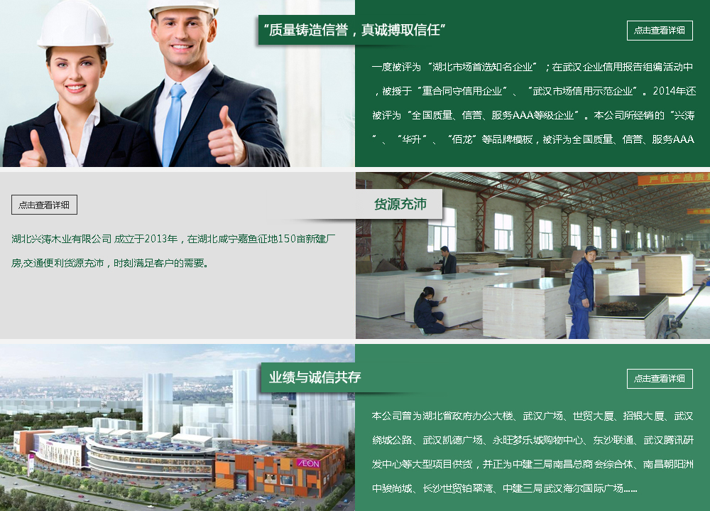湖北興濤木業有限公司成立于2013年,在湖北咸寧嘉魚征地150畝新建廠房,公司立足于武漢地區,業務輻射湖北及周邊地區,多年來致力于木枋、模板批發業務,公司以“質量鑄造信譽,真誠搏取信任”為宗旨,以多品種、低價格、優質量深受廣大客戶的青睞,是一家在木枋模板行業中處于優秀地位的廠家。公司一度被評為“湖北市場知名企業”;在武漢企業信用報告組編活動中,被授于“重合同守信用企業”、“武漢市場信用示范企業”。2014年還被評為“全國質量、信譽、服務AAA等級企業”。本公司所經銷的“興濤”、“華升”“佰龍”等品牌模板,被評為全國質量、信譽、服務AAA等級品牌模板。